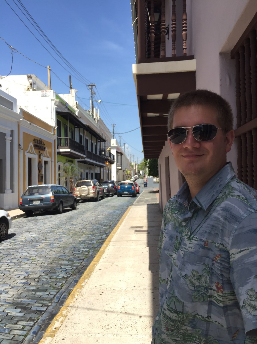 Published July 5, 2015 at 2448 × 3264 in Puerto Rico: Some History for Him, A Little Adventure for Her (Part 2 of 2) ← Previous Next → Paul in the streets of Old San Juan – notice the blue-tinted street pavers?