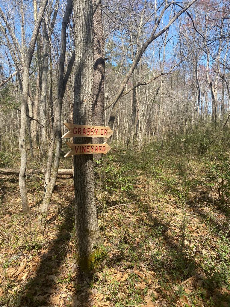 Saturday morning we slowly woke up and laughed off the last night’s antics. I made my standard breakfast of scrambled eggs, sausage, and pancakes with lots of coffee. Thanks to the full hookups, we all took showers and got ready to hit the trail. The destination was Grassy Creek Vineyard which is located just 1.5 miles from the campground. The Grassy Creek trail was really pretty with cute signs pointing the way.